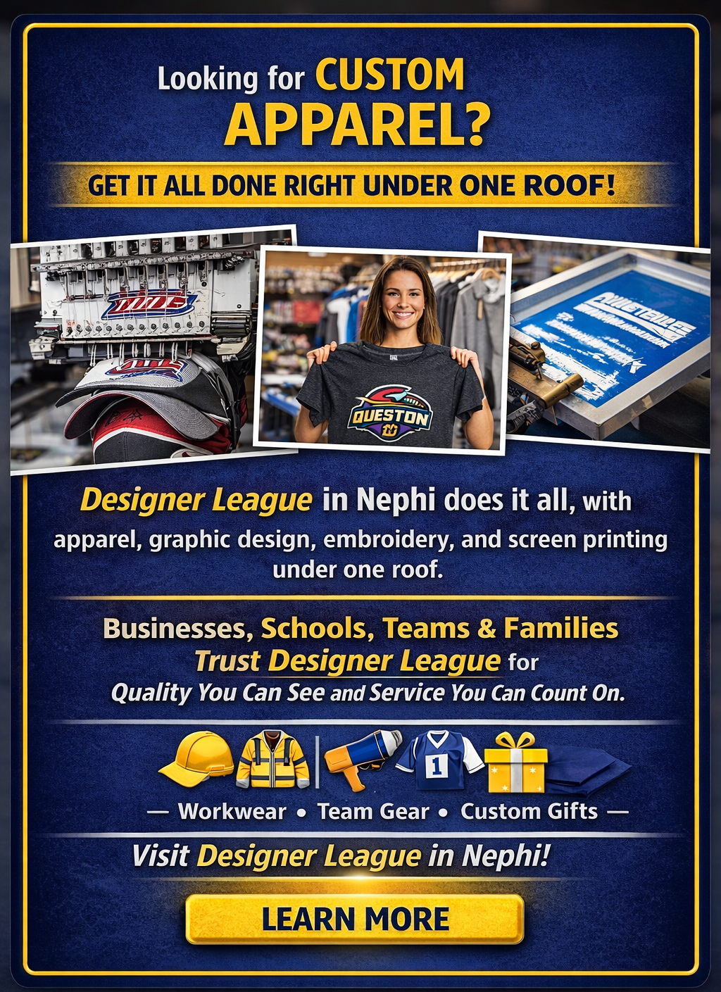 Proudly Stitching the Fabric of Nephi, Utah, and neighboring communities like Payson, Santaquin, Spanish Fork, Mona, Levan, and Mount Pleasant. At Designer League, we’re not just about threads and fabric—we’re about community, creativity, and craftsmanship. We are proud to support local schools, teams, and businesses. We aim to deliver high-quality, personalized garments that feel as good as they look. Whether you're ordering for a team, an event, or your business, we’re here to help you make a lasting impression, one stitch at a time.
